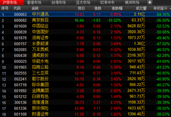 而在龙头股中,中兴通讯重挫64%,最为受伤。年初市值1525亿,目前市值仅剩546亿,千亿市值被蒸发。其次是南京新百,暴跌56.5%;中国铝业、浙商证券、新华保险等均跌超38%。