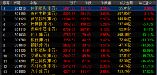 今年以来实现上涨的个股仅有休闲服务、医药生物、视频饮料等消费、医药股。其中,休闲服务涨幅高达8.98%,领涨所有板块。