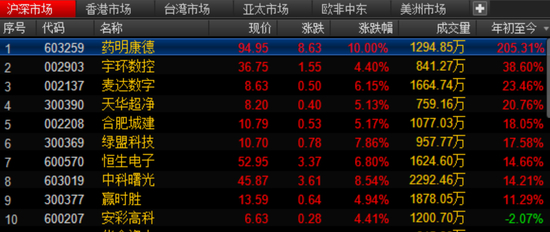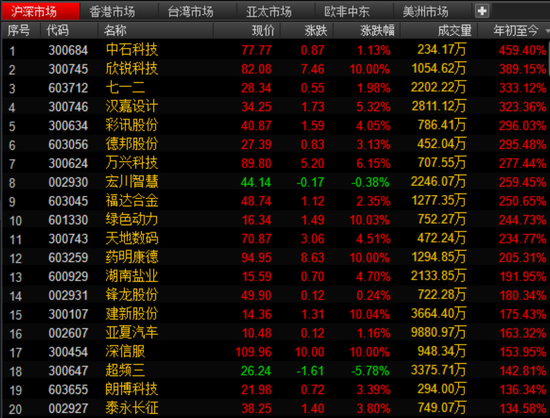 今年以来共有30只个股涨幅超100%,其中,中石科技暴涨459.4%,领涨A股股市,新锐科技涨389.15%,七一二涨333%,德邦股份涨295%,明星企业药明康德涨超2倍,录得205%的涨幅。