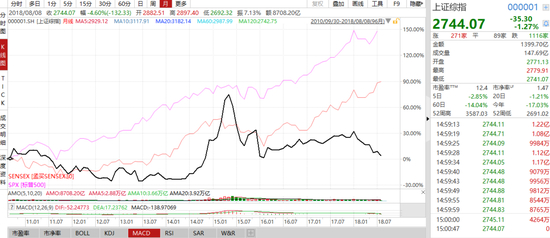 印度股市10年涨30000点,A股10年涨1000点。印度股市自2008年金融危机以来,已经经历了一轮长达10年的牛市,孟买敏感30指数更是从2008年最低的7697.39点,涨至目前的37884.76点,涨幅约392%。而同期的上证指数,自1664点以来,截至今日收盘报2744.07点,涨幅仅有71.5%,最近更是几度跌破2700点关口。
