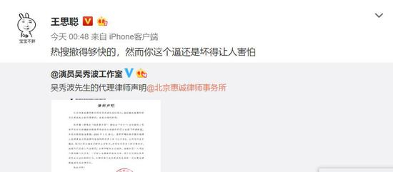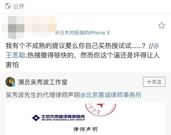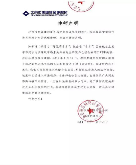事情炸开了锅,吴秀波方倒是火速做出了回应——一份律师声明。
