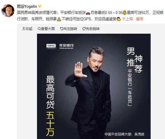 在互联网金融的大潮下,吴秀波也代言了金融产品。2017年,吴秀波不仅成了51信用卡的首席产品体验官,还是中国平安银行的品牌大使。