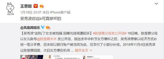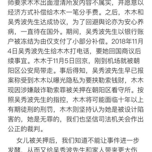 陈昱霖父母表示,在去年陈昱霖亲自曝出吴秀波的六角恋出轨门后,吴秀波愿意给她一些分手费。但是,吴秀波却以银行冻结为借口,仅仅支付了一小部分。