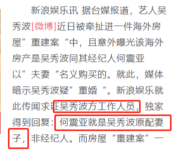 当时吴秀波工作人员公开回复,何震亚就是吴秀波的原配妻子。