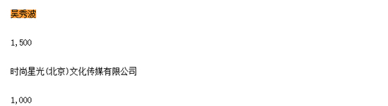 其中包括北京健一酒店管理有限公司、霍尔果斯不二文化传媒有限公司(以下简称“不二文化”)、上海信持望影视文化工作室、北京牛角村餐饮管理有限公司、新沂暖洋影视文化工作室(有限合伙)。