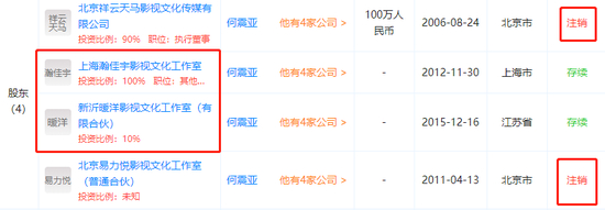 而何震亚名下的影视公司也不少。她是1家影视公司、3家文化工作室的股东,不过其中已经有两家注销。除了新沂暖洋影视文化工作室(有限合伙),另一家是上海瀚佳宇影视文化工作室。据相关媒体报道上海瀚佳宇影视文化工作室就是吴秀波工作室。