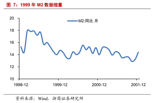 流动性数量,M2 缩量。截止 1999 年,M2 相比社融和贷款,数据更为详实和可得。M2 增速,在 1998 年至 2001年,分别收于 15.3%、14.7%、13.99%、14.4%,市场流动性处于紧缩通道。