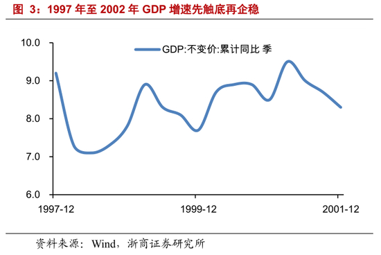 GDP 增速先触底再企稳。中国 GDP 增速,在 1997 年至 2002 年,分别收于 9.2%、7.8%、7.7%、8.5%、8.3%、9.1%。GDP 增速,先在 1997 年至 1999 年持续下滑,收于 1999 年的 7.7%;GDP 增速,再在 2000 年至 2002 年企稳,中枢保持在 8.0%以上。