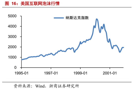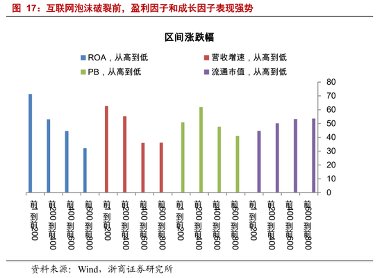 互联网泡沫前的 A 股市场,科技+业绩主导。美国市场,1995 年到 2001 年发生互联网泡沫行情,以互联网为代表的科技股持续走强。1995 年 1 月至 2000 年 3 月,美国纳斯达克指数从 758 点上涨到高点 5048 点。美股映射,中国市场在 1999 年 5 月 19 日至 2000 年 3 月 10 日期间,科技股表现强势;数据进一步显示,业绩表现优秀的公司明显跑赢市场。