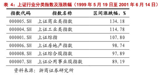 上市公司利润增速,1999 年、2000 年不到 20%。上证综指主营业务收入增速,在 1998 年至 2001 年,分别收于4.0%、13.0%、20.5%、9.5%。上证综指归母净利润增速,在 1998 年至 2001 年,分别收于-14.2%、18.3%、15.6%、-10.0%。总量上,上市公司利润增速大幅跑输工业企业利润, 1999 年、2000 年前者实现增长 18.3%、15.6%,后者实现增长 51.9%、86.2%。结构上,1999 年上半年,上市公司利润增速不升反降,收于-3.7%,而同期工业企业实现增长70.6%。