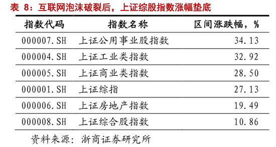 互联网泡沫破裂后,科技股表现走弱。在此阶段,上证综合股指数涨幅垫底,仅有 10.8%,同期上证综指累计上涨 27.1%。前文已经验证,上证综合股指数,与科技股高度相关,市场对科技股不再认可。
