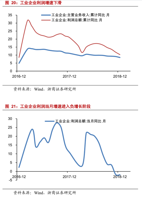 工业企业利润增速正在下滑。2018 年,工业企业主营业务收入增速、利润总额增速,分别收于 8.5%、10.3%,均处于下滑通道。2018 年 11 月、12 月,工业企业利润当月增速分别收于-1.8%、-1.9%,已经进入负增长阶段。展望 2019年前三季度,经济进入去库存阶段,PPI 处于下滑通道,工业企业利润增速有望进一步下滑。