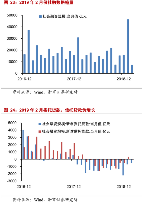 信用在曲折中扩张。经济政策从 2018 年金融去杠杆转为 2019 年金融稳杠杆,信用有望修复。但信用修复缓慢,流动性扩张受限,造成企业融资难融资贵,或导致 2019 年经济困难局面。2 月份社融数据已经公布,信贷扩张存在曲折。总量来看,2 月份社融新增规模 7029 亿,前值 46352 亿,去年同期 11893 亿,有所下滑。结构来看,2 月份委托贷款、信托贷款分别下降 508 亿、37 亿,继续处于负增长状态。