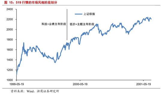 519 行情,结构角度分为 2 个阶段,分别是科技+业绩主导阶段、低价+主题主导阶段。第一阶段,从 1999 年 5 月19 日至 2000 年 3 月 10 日,盈利能力强、营收增速高的企业表现强势,科技股表现活跃。第二阶段,从 2000 年 3 月10 日至 2001 年 6 月 14 日,市场不再由业绩主导,开始进入消灭低价股阶段,B 股以估值极低、市值极小表现最为强劲;与此同时,互联网泡沫破裂,科技股强势不再。