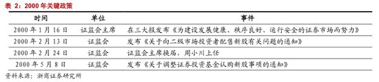 2000 年,证券发行机制改革,政策利好进一步刺激市场上涨。2000 年,证券市场的政策主线是发行机制改革,发行机制逐步由计划体制向市场化体制转变。2000 年 1 月 16 日,证监会主席在三大报公开发文,文章题目《为建设发展健康、秩序良好、运行安全的证券市场而努力》,上证综指次日上涨 1.74%。2000 年 2 月 13 日,证监会发布《关于向二级市场投资者配售新股有关问题的通知》,上证综指次日上涨 9.05%。2000 年 2 月 24 日,证监会换届,周小川主席上任,上证综指当日上涨 2.07%。2000 年 5 月 8 日,证监会发布《关于调整证券投资基金认购新股事项》,市场微涨。