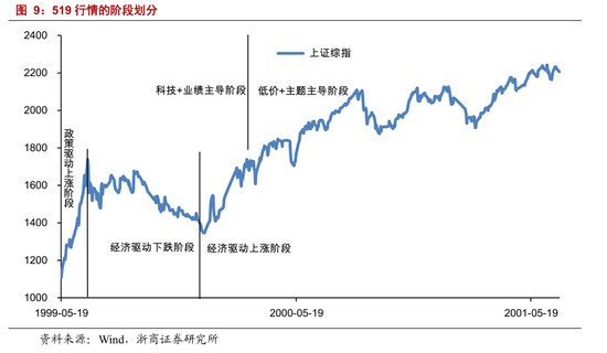 519 行情,总量角度分为 3 个阶段,分别是政策驱动上涨阶段、经济驱动下跌阶段、经济驱动上涨阶段。第一阶段,从 1999 年 5 月 19 日至 1999 年 6月 30 日,政策利好密集出台,上证综指累计上涨 59.4%。第二阶段,从 1999年 6 月 30 日至 1999 年 12 月 27 日,经济存在失速风险,《证券法》实施构成催化剂,上证综指累计下跌 22.6%。第三阶段,从 1999 年 12 月 27 日至 2001年 6 月 14 日,企业利润向好,发行机制改革构成催化剂,上证综指累计上涨63.7%。