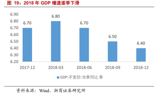 2018 年 GDP 增速下滑。2018 年国内外经济形势错综复杂,中美贸易摩擦爆发,国内信用环境紧缩,共同驱动经济增速整体下滑。全年来看,2018 年实现 GDP 增长 6.6%,前值 6.8%,整体出现下滑。季度来看,全年 4 个季度分别实现 GDP 增长 6.8%、6.7%、6.5%、6.4%,经济增速逐季下滑。