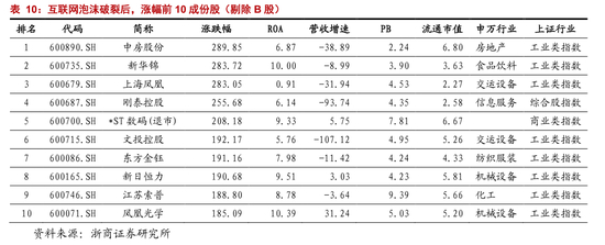 个股表现,低价股最为强势,B 股狂飙暴涨。B 股,是最为典型的低价股;一方面,估值极低,PB 不到 1 倍,中枢仅有 0.5 倍;一方面,流通市值极低,B 股流通市值折合到人民币,普遍不到 1 亿。互联网泡沫破裂后,B 股成为涨幅榜的统治者,涨幅前 20 的股票均为 B 股,涨幅中枢在 10 倍左右。