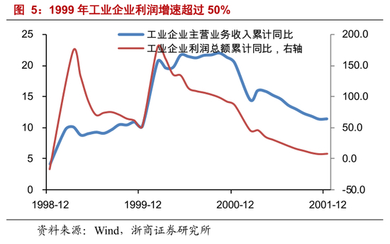 工业企业利润增速,1999 年、2000 年超过 50%。工业企业主营业务收入增速,在 1998 年至 2001 年,分别收于4.1%、10.2%、20.4%、11.4%。工业企业利润总额增速,在 1998 年至 2001 年,分别收于-17.0%、51.9%、86.2%、8.1%。