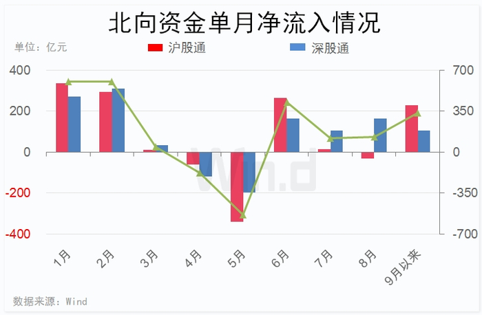 Wind数据统计显示,9月以来,北向资金累计净流入规模已达331.72亿元。其中沪股通净流入规模227.05亿元,深股通净流入规模104.67亿元。