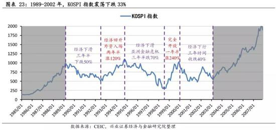 2) 1989-2002年韩国经济转型,股票市场对外开放,指数在震荡行情中迎来两轮牛市,分别两年半涨120%、一年半涨240%