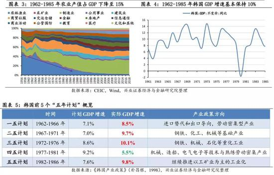 这一阶段韩国通过5个“五年计划”基本完成了工业化,GDP年均增速10%。