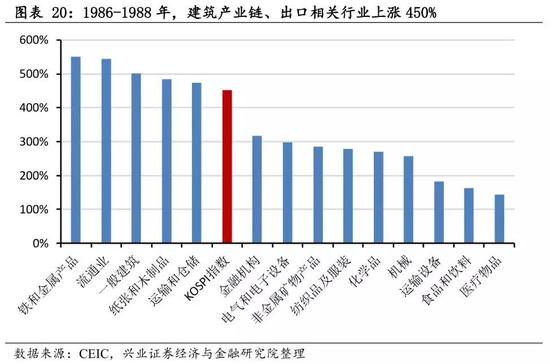 油价、汇率、国际市场环境整体改善,韩国出口额同比增速达到35%,成为这一阶段经济增长的主要动力,GDP继续保持以10%的速度增长。此时韩国仍处于工业化阶段,货币政策整体偏宽松,M1、M2同比增速均保持30%左右,增加货币供给刺激实体经济发展的同时,也为股票市场提供了充裕的流动性。受益于奥运会的建筑产业链,以及受益于出口的行业表现较好,均以450%以上的涨幅领跑。