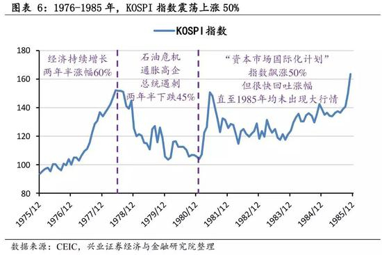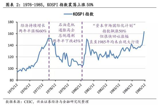 1)在经济持续增长的推动下,韩国股市从1976年起迎来两年半的牛市,KOSPI指数从94点涨至152点,涨幅达到60%。
