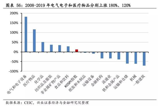 油价、汇率、国际市场环境整体改善,韩国出口额同比增速达到35%,成为这一阶段经济增长的主要动力,GDP继续保持以10%的速度增长。工业化阶段的货币政策整体偏宽松,M1、M2同比增速均保持30%左右,增加货币供给刺激实体经济发展的同时,也为股票市场提供了充裕的流动性。受益于奥运会的建筑产业链,以及受益于出口的行业表现较好,均以450%以上的涨幅领跑。