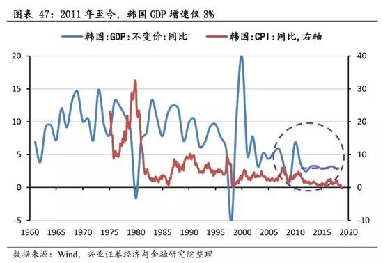 后金融危机时代,GDP增速再次下台阶至3%水平。受全球金融危机的影响,韩国GDP增速在2008-2009连续两年下行,由5.8%降至0.8%,2010年出现复苏,回升至6.8%。但这之后韩国GDP仅保持每年3%左右的增长水平,增速较金融危机之前又下了一个台阶。