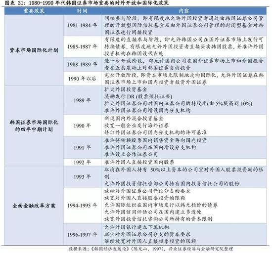 1)1992年,韩国设立QFII制度,允许外资直接投资股票市场,持股比例限制为10%,韩国股市首次被纳入MSCI 新兴市场指数,纳入比例为20%;