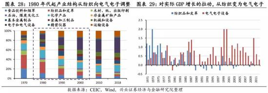 产业结构从以纺织业为代表的劳动密集型轻工业,转向以电气电子为代表的技术密集型产业。1980年纺织行业和电子电气行业产值占GDP比重分别为25%和10%,2000年时则为8%和25%,产业结构出现明显改变。新千年后韩国产业结构总体保持稳定,目前纺织行业和电子电气行业产值占比分别为4%和32%。从对实际GDP增长的拉动效果来看,90年代以前纺织行业的贡献明显,1990年代以后电气电子行业的贡献明显超过纺织行业。