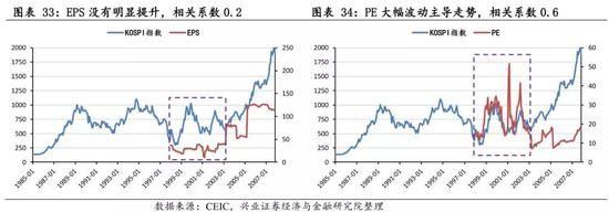 从盈利和估值的角度分析,指数PE大幅波动,主导走势。由于正处于经济转型期,KOSPI指数在EPS方面的表现乏善可陈,没有出现较明显的提升。指数与EPS的相关系数仅0.2,与PE的相关系数为0.6,估值成为指数走势的主导因素。同时我们也可以看到,指数PE在这一时期大幅波动,说明此时韩国股票市场的成熟度仍较低,市场稳定性较差。