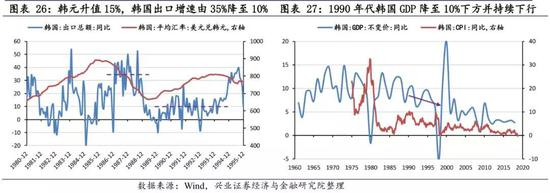 劳动力比较优势的丧失,叠加韩元升值约15%,韩国出口额增速中枢明显下移,由35%降至仅10%。出口恶化对GDP带来了明显的拖累,1990年代韩国GDP增速降至10%下方,并且持续下行。