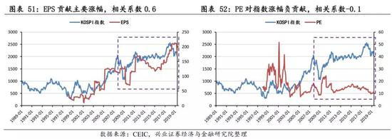 从盈利和估值的角度分析,EPS驱动指数上涨。这一阶段KOSPI指数的EPS由40提升至110,贡献了指数90%的涨幅;PE由15倍提升至17倍,仅贡献了指数10%的涨幅。