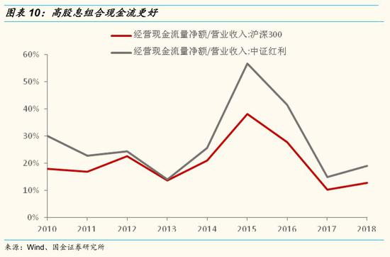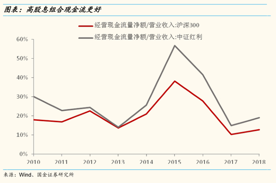 从数据上来看,我们确实能看出高分红股票的ROE和净现比(经营活动现金流金额/营业收入)都高出基准水平。我们还是以中证红利指数成分股代表高分红组合,以沪深300为基准,我们发现2010年以来中证红利指数成分股ROE整体均高于沪深300指数成分股。而现金流方面,中证红利指数成分股经营现金流净额占收入比同样高出沪深300指数成分股。