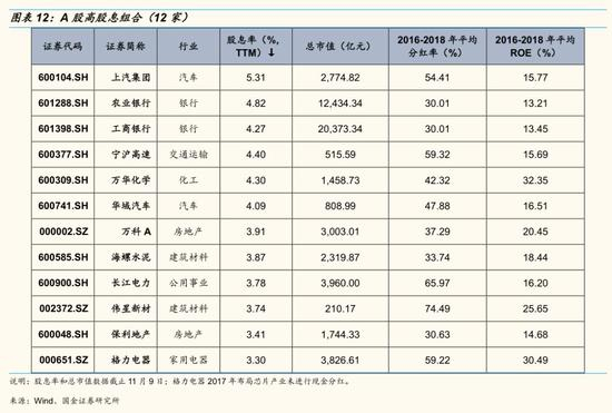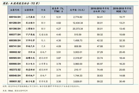 五、我们从“现金分红、基本面、行业分布”三个维度来构建A股高股息组合。具体筛选指标如下:1)现金分红:股息率高于3%、2010年以来每年进行现金分红且过去三年每年分红率高于30%;2)基本面:总市值大于200亿、2010年以来每年ROE大于10%、最新ROETTM大于10%;3)行业分布:为防止所构建组合行业过度集中,限定每个行业公司数量不超过2家,符合标准的同一行业多家公司选取股息率最高的两家公司。由此,我们构建的A股高股息组合包含12只个股,分别为:上汽集团、农业银行、工商银行、宁沪高速、万华化学、华域汽车、万科A、海螺水泥、长江电力、伟星新材、保利地产、格力电器。