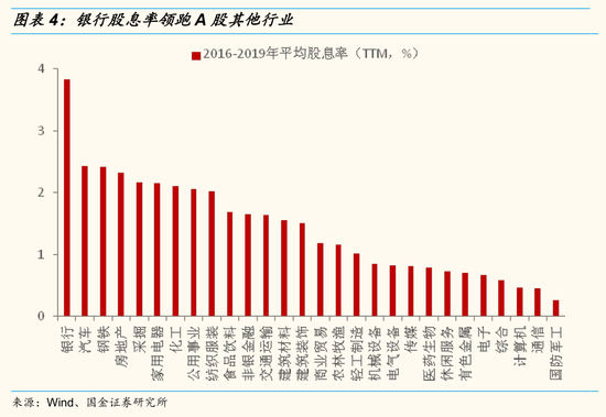 对于上市公司现金分红,投资者最关心的莫过于股息收益率(每股现金分红与股价的比值),即股息率。与国际主要市场比较,A股整体股息率并不高,沪深300指数2016-2019年平均股息率为2.16%,低于3%左右的全球平均,但已经与美股股息率相当。但是从行业结构来看,部分行业股息率相对较高,其中典型的代表是银行,2016-2019年银行平均股息率高达3.8%,主要得益于银行股的持续高分红以及行业的低估值属性。