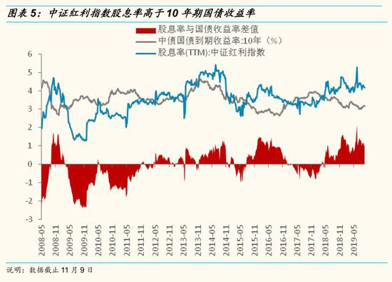 从国内情况来看,2018年下半年以来,以中证红利指数为代表的A股高股息组合的股息率持续高于10年期国债收益率,高股息组合的相对配置价值显著。具体来说,截止11月9日,中证红利指数股息率为4.2%,高出3.2%的10年期国债收益率1个百分点。