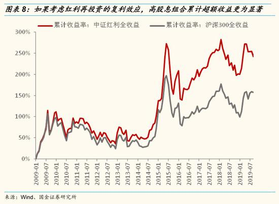 长期来看,高分红组合能获取明显的超额收益。2009年以来,以中证红利指数为代表的高股息组合累计超额收益率为35.01%(以沪深300为基准,截止11月9日),如果考虑红利再投资的复利效应,高分红组合的超额收益率将更高,高达84.60%。