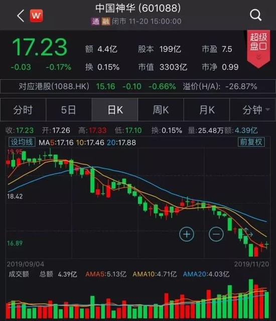 11月20日,中国神华报收于17.23元/股,在上周五跌破17.44元的每股净资产、创出上市以来第三次破发后,连续四个交易日以破净价报收。
