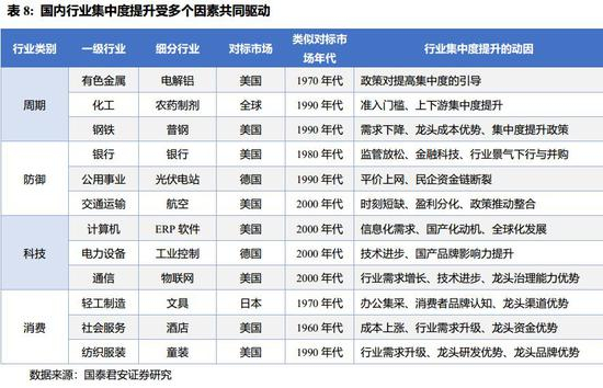 我国行业集中度提升也受多因素共同驱动。如普钢行业将受到需求下降、龙头公司成本优势、行业集中度提升政策影响,银行业受到监管放松、金融科技发展和行业景气下行导致的并购整合影响。下表列出了我国部分行业集中度提升的驱动因素。