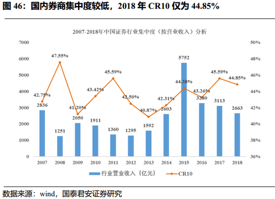 我国证券业正处于转型中,未来呈现国际化、头部化趋势。我国证券行业经过近20年发展,同质化竞争严重,行业集中度较低。2018年国内共131家证券公司,总资产6.26万亿元,CR10仅为44.85%。在经纪业务进入存量博弈阶段,行业竞争加剧,在此背景下国行业进入转型期,变革传统业务,加大金融科技投入,两融、股权质押、直投、期货、融资租赁等创新业务成为趋势,以中信证券、华泰证券等为代表的头部券商有望加速提高市占率,同时在全球化竞争中,开始走国际化路线。