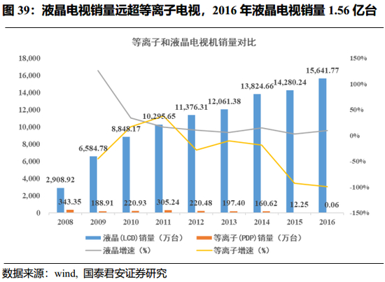 半导体技术优势,是等离子显示失败的根本因素。1997年12月,日本先锋推出全球第一台家用等离子电视,使等离子电视首次进入家庭。与CRT相比,等离子显示具有分辨率高、屏幕大、超薄、色彩丰富鲜艳等优点;与LCD相比,其亮度、对比度、颜色等也优势明显。但是由于真空技术限制,等离子显示只适合大型电视产品,而LCD为代表的半导体显示,不仅可用于电视产品,手机、平板、笔记本电脑、可穿戴电子产品等都可以使用,这是LCD真正超越等离子体胜出的根本因素。