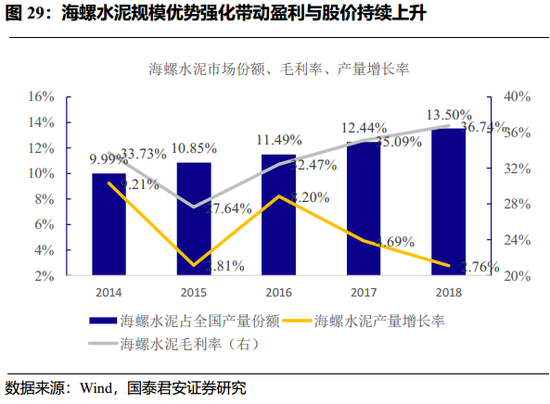 规模优势持续强化可以带来盈利和股价持续上升。以全球市值最大的水泥公司海螺水泥为例,2014-2018年公司水泥产量复合增长率仅5.5%,全国市场占有率从9.4%提升至13.5%,毛利率从34%提升至37%,净利润增长率高达26%,2014年以来股价上涨216%。