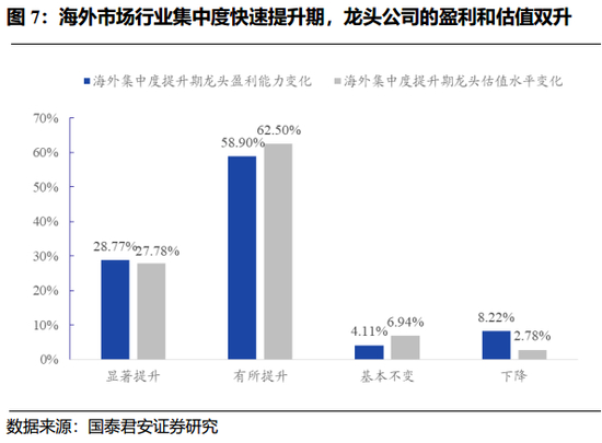 海外市场行业集中度快速提升期,龙头公司盈利与估值双升,实现戴维斯双击。在集中度快速提升期,海外市场29%的行业,龙头公司盈利能力显著提升;28%的行业,龙头公司相对市场的估值显著提升。