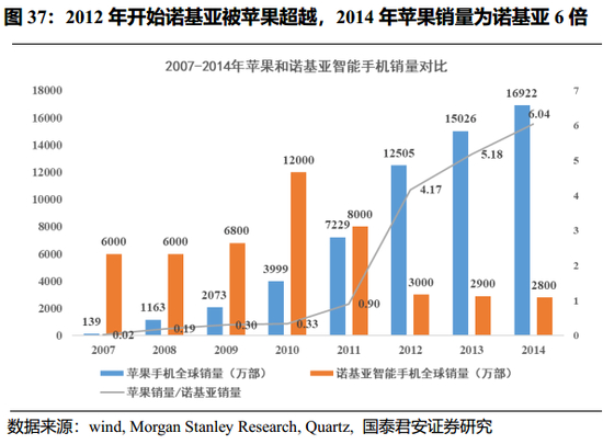 脱离市场,诺基亚在智能时代抢占先机,却最终败在苹果脚下。诺基亚作为全球功能机龙头,在2000年就设计触屏智能手机。但由于管理层无视消费者需求,面对手机市场快速变换的需求,没有及时进行战略调整, 2011年其手机市占率降至25%,随后被苹果和三星等智能手机厂商超越。到2014年,诺基亚销量降至2800万部,而苹果则达到1.60亿,为诺基亚的6倍,诺基亚在智能手机时代虽然抢占先机,缺最终败在苹果脚下。