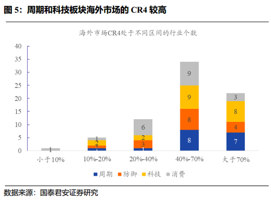海外市场,周期与科技板块市场集中度最高。海外对标的周期与消费行业中,近40%的行业CR4在70%以上,包括周期行业的电解铝、油田服务,科技行业的碳纤维、锂电池等。周期行业由于需求增长下降,行业整合较为充分。科技行业的龙头公司技术优势较大,也具有垄断份额。