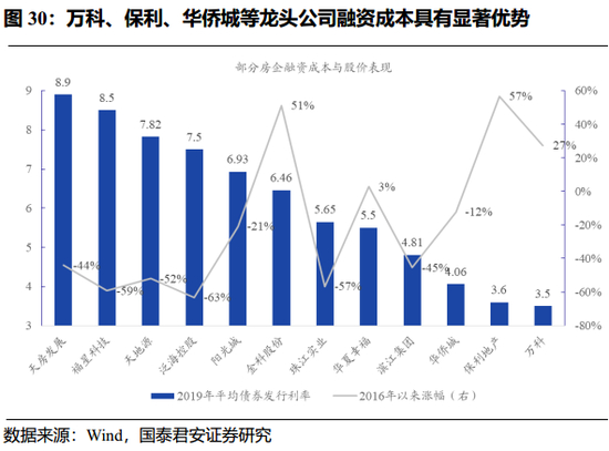 具有资金优势的公司股价表现更出色。以前述不同融资成本的代表性地产公司为例,发债成本大于7.5%的4家公司2016年以来平均下跌55%,发债成本小于4.5%的3家龙头公司同期股价平均上涨24%。