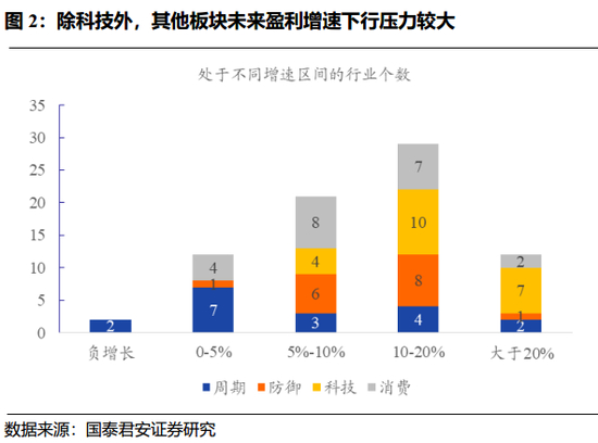 未来周期、消费和防御板块增速回落较大,由传统的增量市场进入存量市场的可能更大。周期、消费和防御行业分别仅33%、43%和56%的子行业未来5年预期收入增速大于10%。